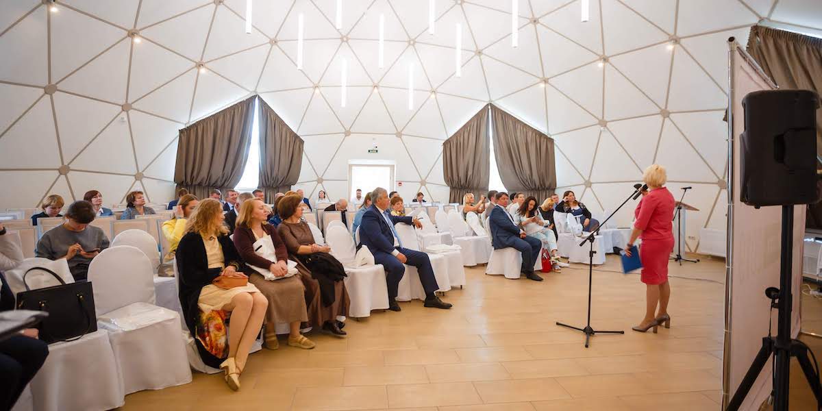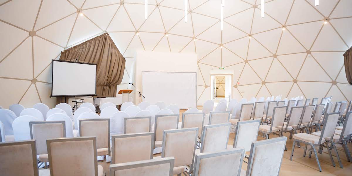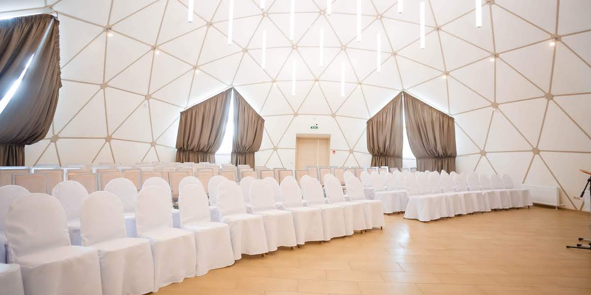 Конференц-зал «Атмосфера» - универсальная площадка общей площадью 150 м² (в том числе большой купол 64 м²) адаптируется под формат вашего мероприятия:
