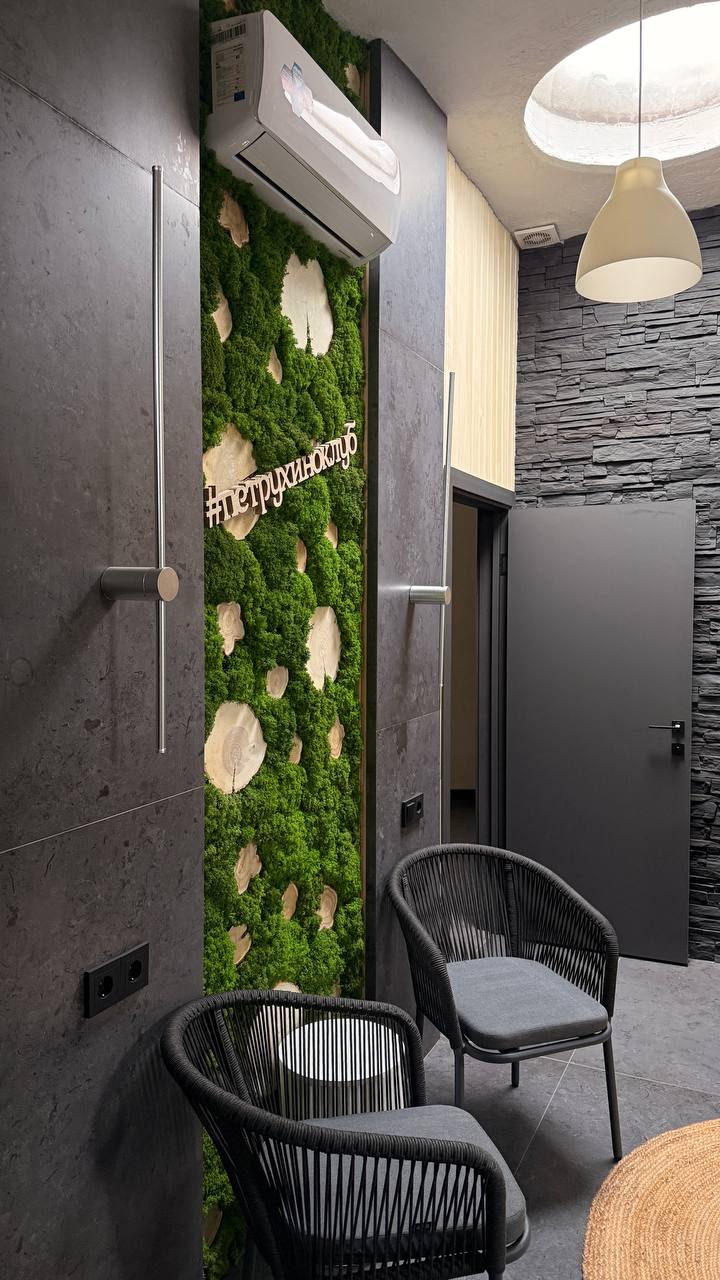 Акцентное панно из мха добавляет живой фактуры и природного дыхания - будто лес оказался внутри пространства.