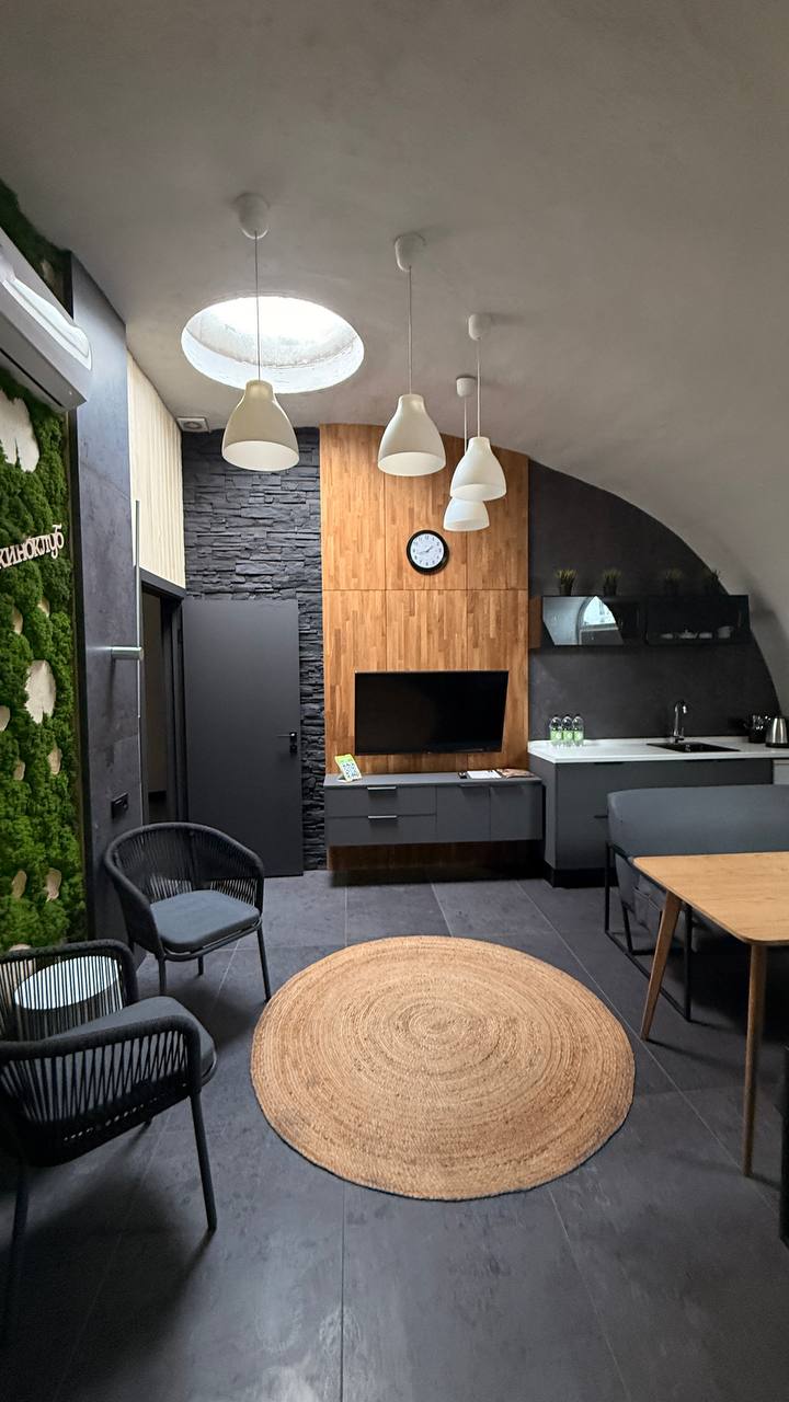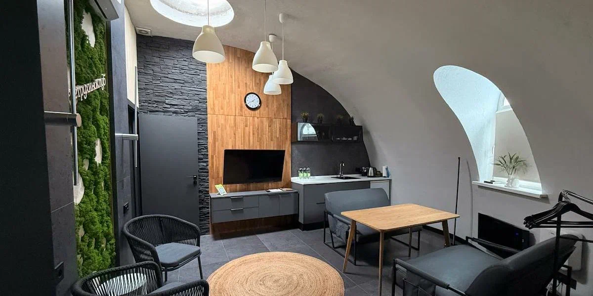 В интерьере тёплые оттенки дерева и спокойного серого. Они не отвлекают, а настраивают на отдых.